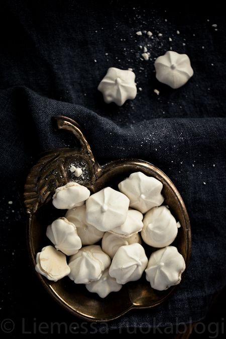 Pursota marenkeja tähtityllan läpi leivinpaperilla vuoratulle pellille. Paista uunissa kiertoilmalla 80 asteessa 1,5 h – 3 h riippuen marenkien koosta ja kuinka kuivaksi marengit haluat.