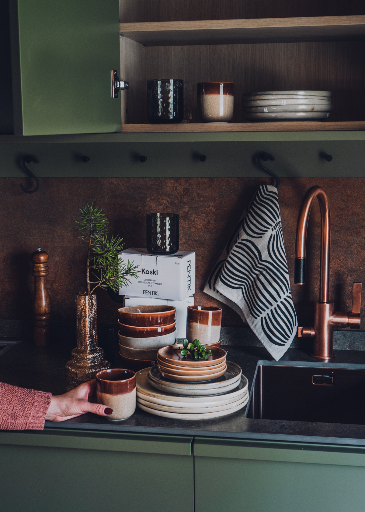 Pentikin kotimaiset, maailman pohjoisimman keramiikkatehtaan Tuntu-sarjan astiat tuntuivat ainoalta oikealta valinnalta mökille. Pentik-Tuntu-sarja on pohjoisen luonnon inspiroima. Siinä on rouheutta, upeita sävyjä ja astioita on helppo yhdistellä. Koski-lasit ja upea Kuulea-maljakko täydentävät astiaston. Mökille valitsin luonnonläheisiä sävyjä sarjasta, mutta siellä on lisäksi hauskoja väripilkkuja ja väriyhdistelmiä jos käyt Pentikin verkkokaupassa katsomassa.