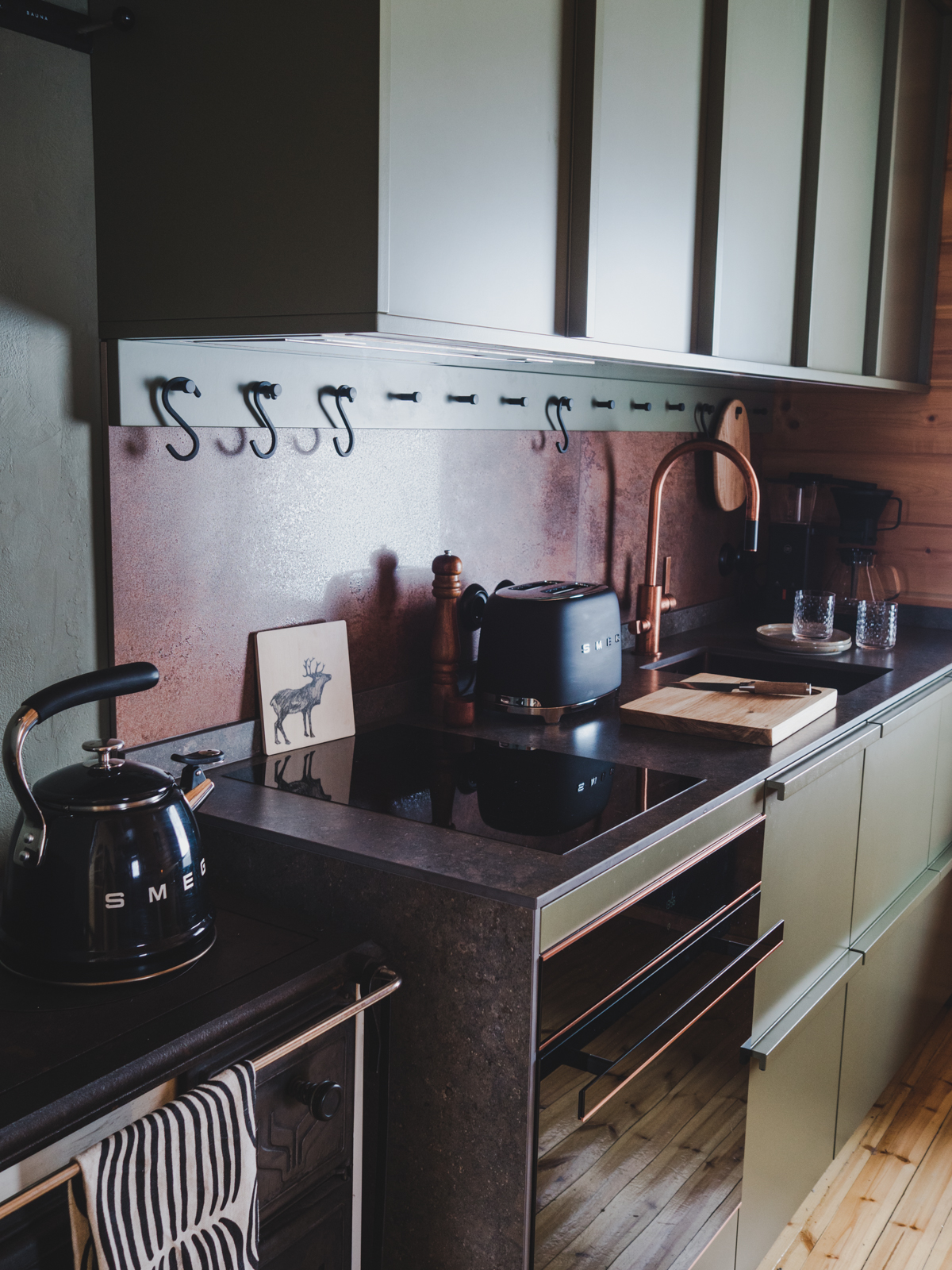 Laadukkaat ja tyylikkäät kodinkoneet löytyivät SMEG:ltä. Kuparinen hana ja allas ovat Tapwellin. Bricmate taso on erittäin kestävää ja helppohoitoista graniittikeramiikkaa. Taso laskeutuu paloturvallisuussyistä myös sivulle puulieden takia. Tasossa ei näy lika helposti ja se kestää niin kuumaa kuin kylmääkin.