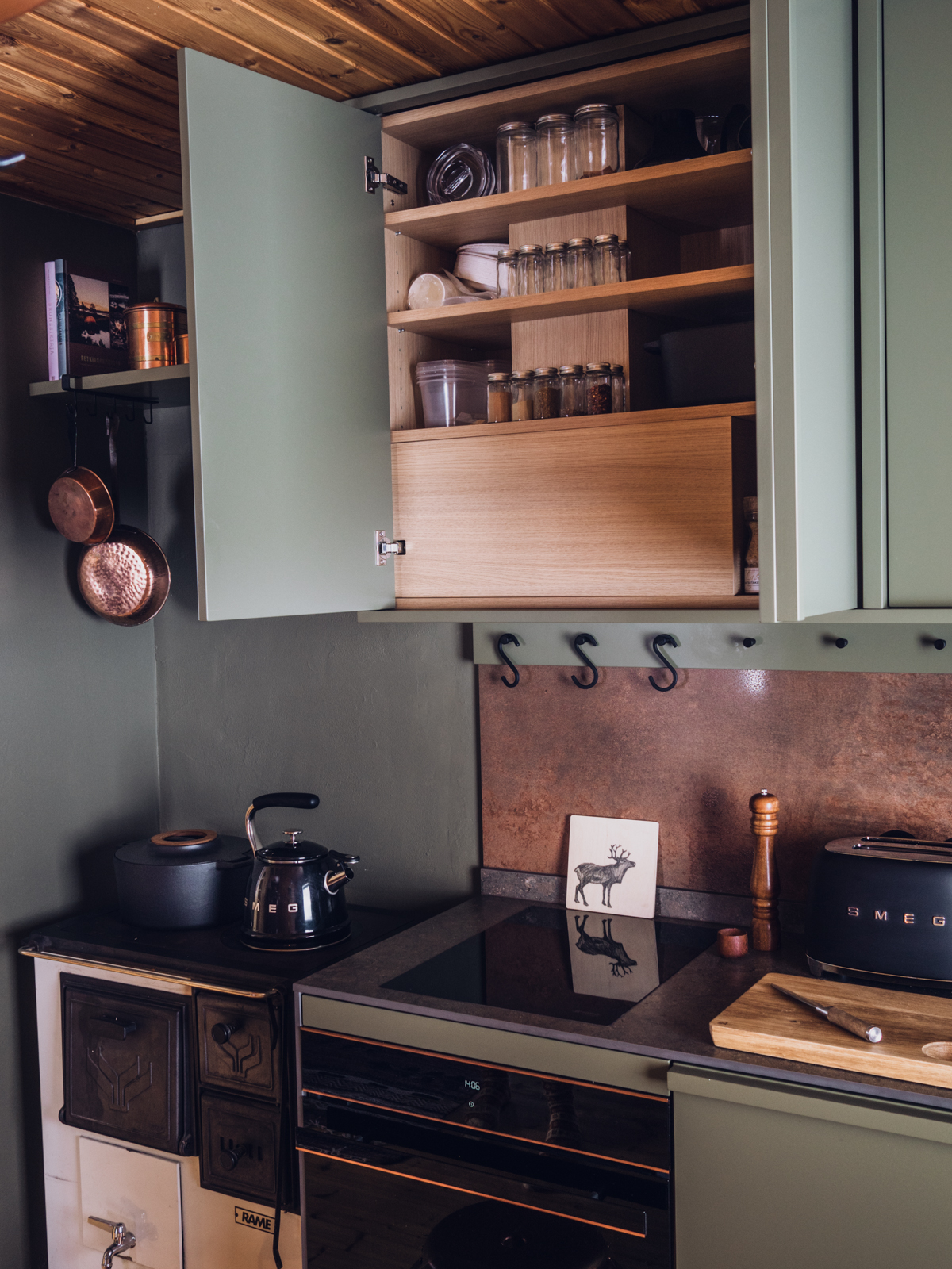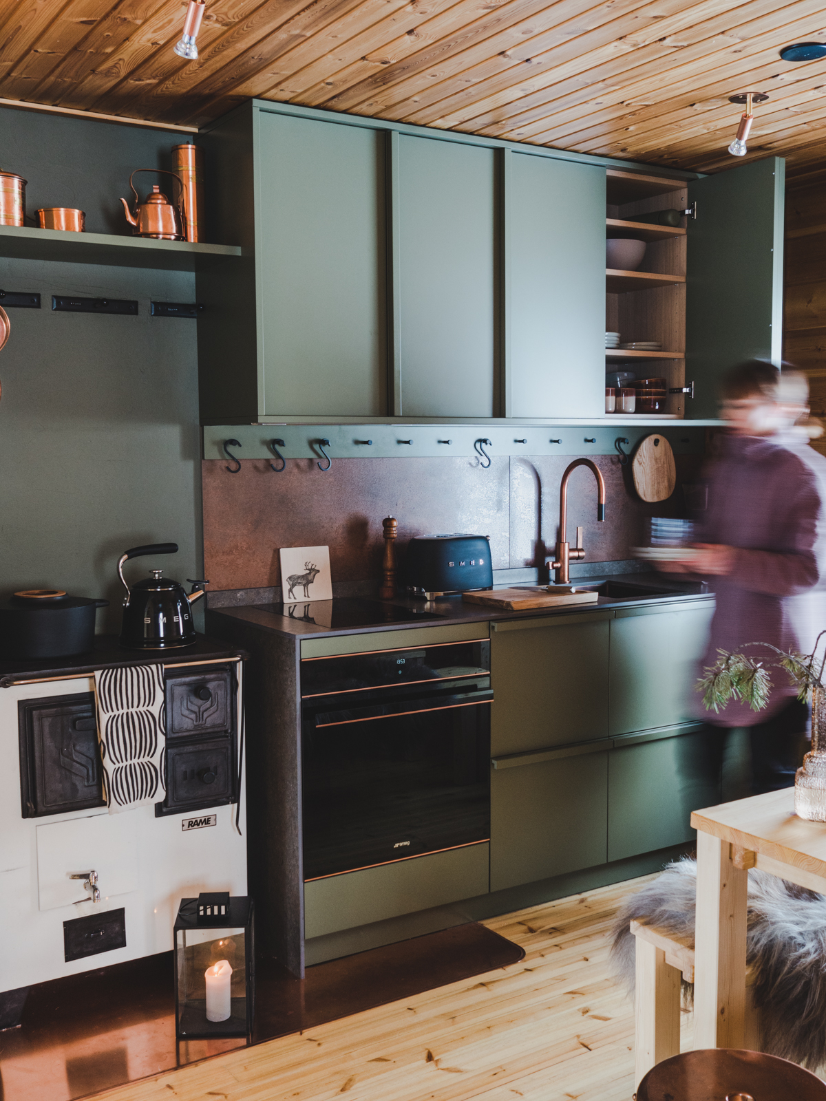 Uusi Doorie keittiö Local-mallistosta on kotimaisella puusepäntehtaalla tehty mittoihin. Jokainen milli saatiin hyödynnettyä pienessä keittiössä. Keittiön maalisävyn pystyi valita täysin vapaasti. Halusin keittiöstä metsän vihreän ympäröivän luonnon mukaisesti. Mielestäni vihreä toimii kauniina vastaparina kellertävälle männylle seinissä, lattiassa ja katossa. Kupari täydentää väripaletin. Vai mitä olet mieltä? Vinkkinä Doorie tarjoaa myös tyylikkäitä ovia ja vetimiä Ikea-keittiörunkoihin. Showroomit löytyvät Helsingissä Annankadulla ja Suutarilassa.